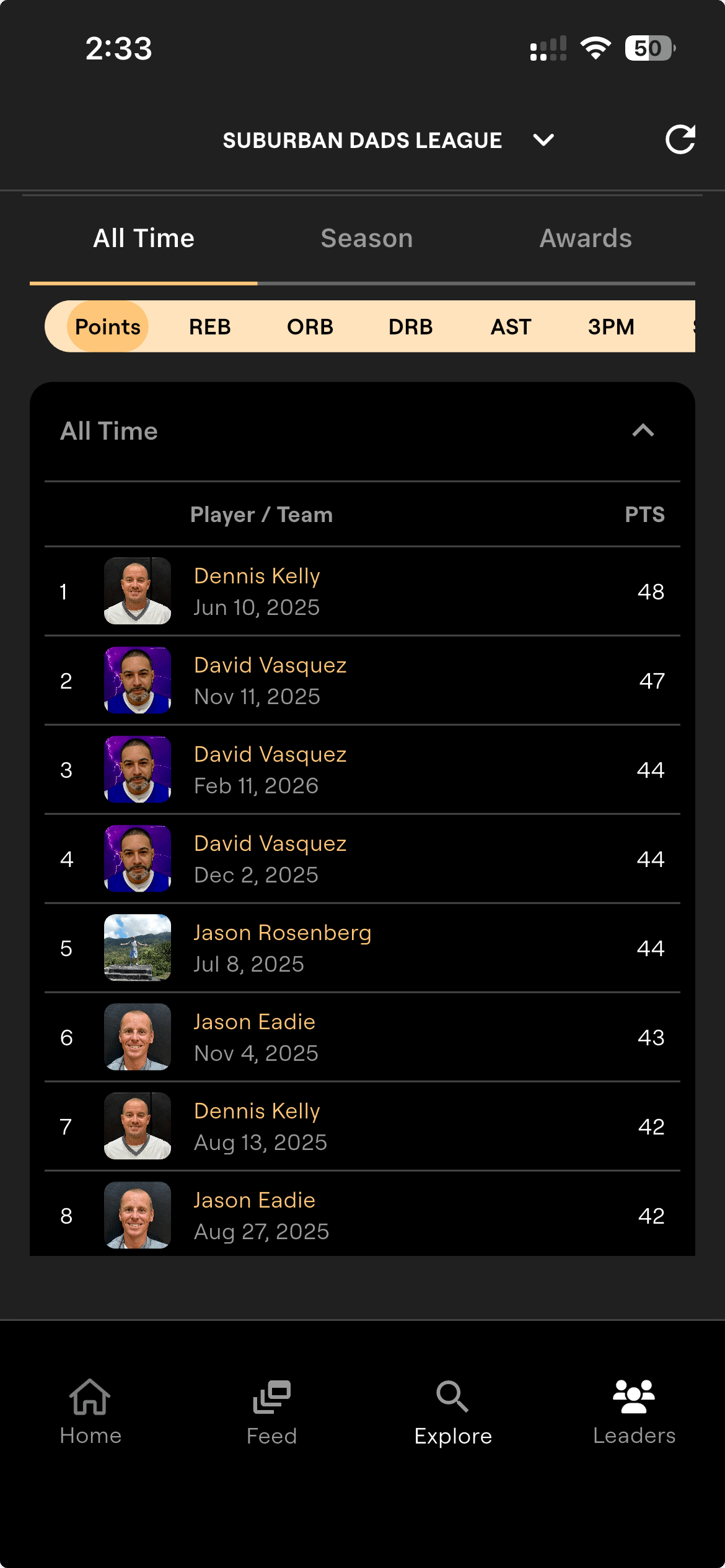 For example, check out the Suburban Dad’s League. Dennis Kelly holds the single-game points record, dropping 48 in Season 1. If only his teamate, and league commish, Jason Eadie, wasn’t so unselfish, he could have turned those 42 and 43 points nights into a league record. We can’t wait to see these guys in Season 3!